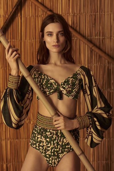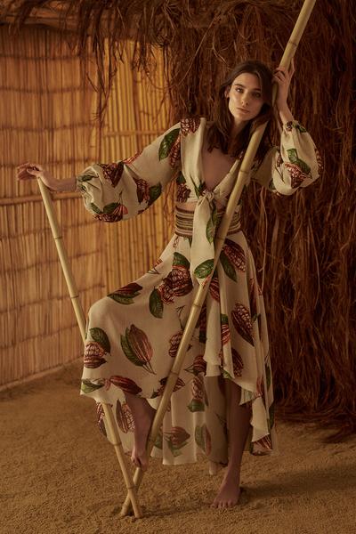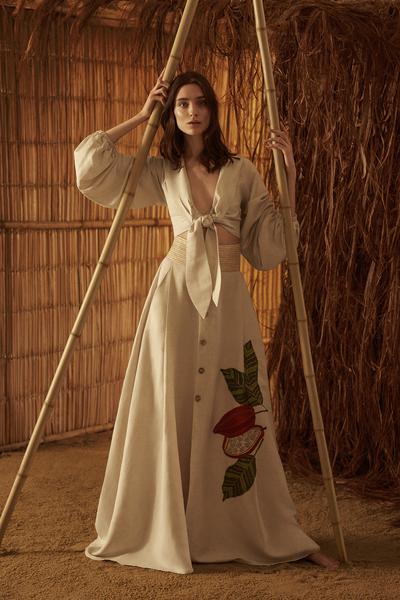 Linho, crepe de chine de fibra e algodão bordado são tecidos protagonistas na coleção que se completa com tricoline e malharia de rayon, muitas vezes finalizados com paetês, tules bordados e malhas brilhosas. Da cidade de Antonina do Norte, Ceará, bordadeiras criaram à mão alças e aviamentos feitos com acabamentos de coco, madrepérola, madeira, bambu ou cordas. Na cartela de cores há predominância de bege e verde, complementadas por off-white, branco e preto, azul marinho, vermelho e pitadas de amarelo.