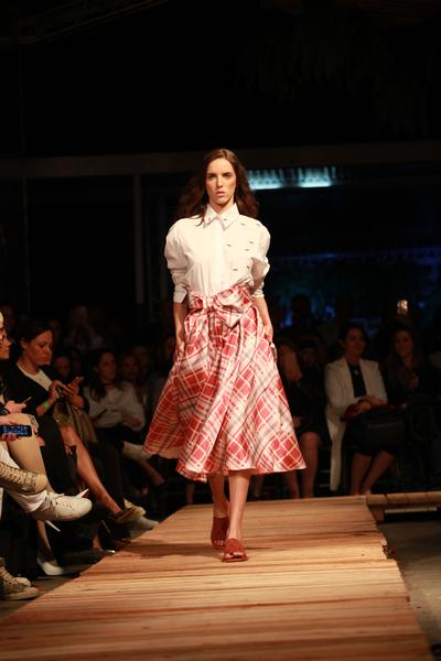 As modelagens são clássicas com um toque retrô, trazendo inspirações dos anos 50 e 60 com vestidos ladylike e saias de comprimento midi em alfaiataria. Os mini comprimentos adornados com patês flúor também são uma aposta do estilista para a estação e aparecem sobrepostos por capas e jardineiras de new plastic transparente compondo looks super jovens e divertidos.